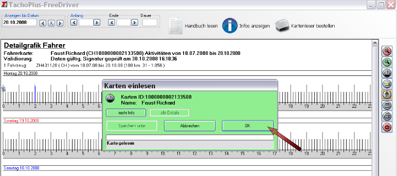 Öffnen Sie das Programm TachoPlus FreeDriver. Stecken Sie nun die Fahrerkarte, auf welcher zuvor die Daten aus dem Fahrzeug abgespeichert wurden, in den Kartenleser. Achten Sie darauf, dass der Chip nach vorne gerichtet ist. Wenn die LED-Anzeige des Kartenlesers zu blinken aufhört und dauerhaft grün leuchtet, können die Daten in das Programm übernommen werden. Klicken Sie dazu auf ‚OK‘