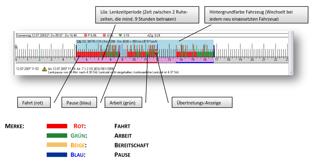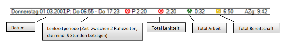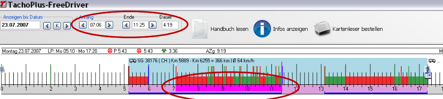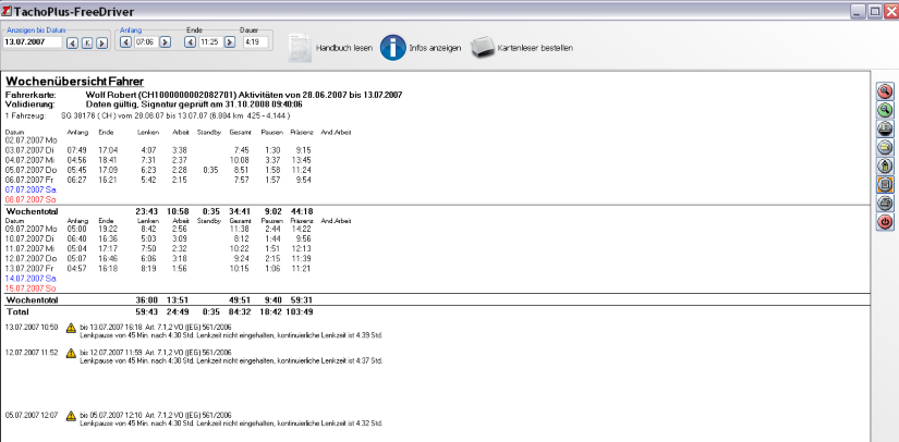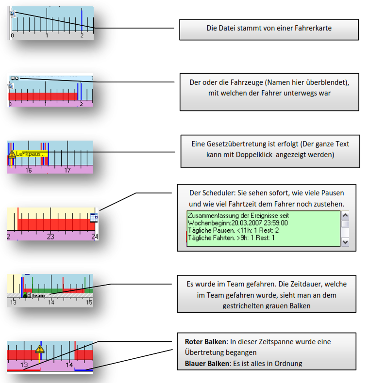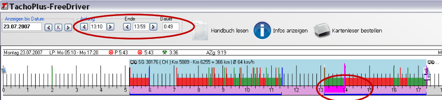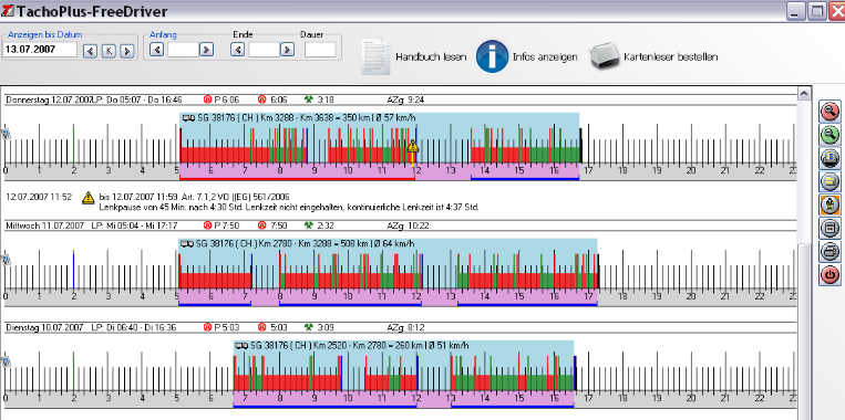 Fahrerkartendaten werden bei ihrem Arbeitgeber erfasst und gespeichert. Fragen Sie den Arbeitgeber nach einer Kopie Ihrer Daten. Lesen Sie die Datei mit dem Namen C_xxxxxxxxxxxxxxxx.DDD ein, in dem Sie diese mit dem ‚Datei öffnen‘ Symbol auswählen. Sofort öffnet sich eine grafische Darstellung, wo Sie auf einfachste Art und Weise Ihre Fahrt-, Arbeits-, Bereitschafts- sowie Pausenzeiten ermitteln können.