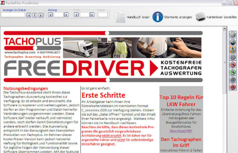 Im Startfenster finden Sie interessante und informative Hinweise über TachoPlus. Drucken Sie sich beispielsweise die 10 Top Regeln für LKW-Fahrer aus, oder bestellen Sie sich das kostenlose Infopaket!