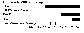 In den USA ist für alle Neufahrzeuge ab dem 1. Januar 1996 OBD-2 vorgeschrieben. Das heißt, daß auch Fahrzeuge für den amerikanischen Markt mit Baujahr 1995 bereits OBD-2 haben können. In der EU ist für Neufahrzeuge mit Otto-Motor ab 1. Januar 2001 mit der EURO-3 Norm OBD-2, hier EOBD genannt, eingeführt worden. Für Pkw-Dieselfahrzeuge wird EOBD am 1. Januar 2003 eingeführt und für Lkw erst am 1. Januar 2005. Auch hier gilt, daß Fahrzeuge mit Baujahr vor diesem Termin schon OBD haben können.